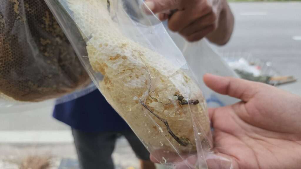 รังผึ้งก็เหมือนกันถ้ารังผึ้งสีเข้มๆอันนี้คือรังแก่ น้ำผึ้งนั้นจะหอมหวานเหนียว กว่ารังผึ้งที่สีอ่อนๆ แต่กินรังจะไม่อร่อย