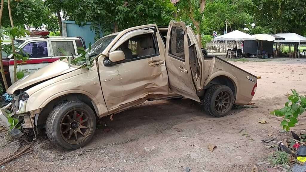 กระบะชนต้นไม้ขาดเจ็บเล็กน้อยคนเห็นมา1ถามบอกมา 3 คน เจ้าของบ้านเผย 3 ปีที่แล้วก็มีแบบนี้ พูดเหมือนกัน เปะ!ชนศาลพระภูมิพังแต่เจ็บเล็กน้อย