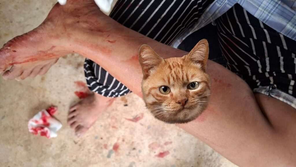 มีบาดแผลจากการใช้มีดทำครัว ยาวประมาณ 1 ฟุต กรีดที่ขาซ้ายของตนเอง มีความยาวของแผลประมาณ 10 cm และบริเวณขายังมีรอยคล้ายของมีคมข่วน