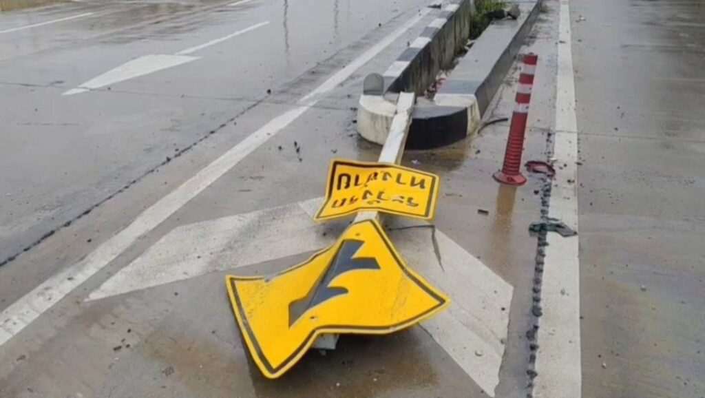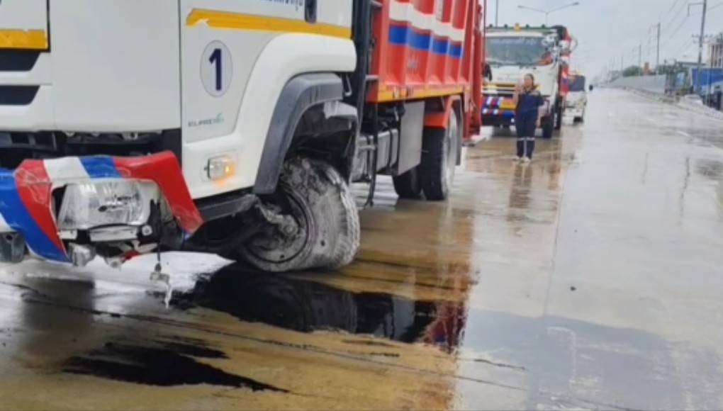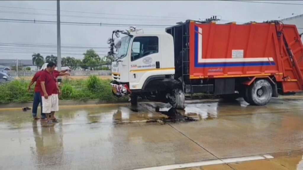 ฝนตกถนนลื่นรถขยะ ลื่นไถลชนป้ายให้ทางทะลุชนขอบราวสะพานโชคดีไม่มีใครเจ็บวอนผู้รับผิดชอบแก้ไขถนนลื่นเป็น เงา