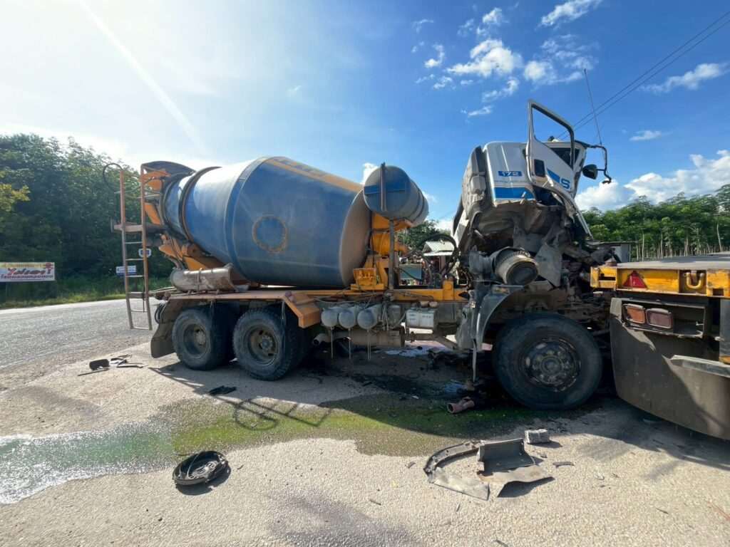 ที่เกิดเหตุพบรถโม่ปูนด้านหน้าฝั่งคนขับชนอัดหางพ่วงรถเทลเล่อร์จนพังยับพบมีปูนอยู่เต็มโม่