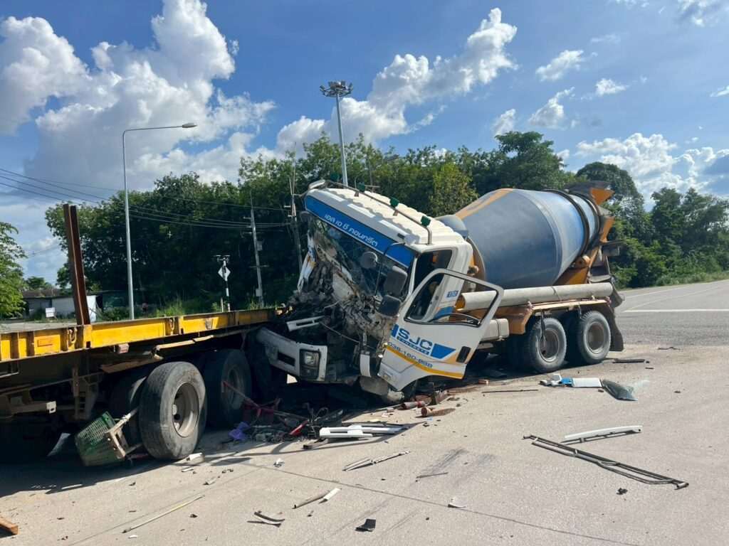 แยกวัดใจรถปูนบวกรถเทลเลอร์หางเปลือย ประสานงากันจังๆรถปูนหน้ายุบเข้าไปข้างในห้องโดยสารใครเห็นก็ไม่อยากจะเชื่อว่าบาดเจ็บเพียงเล็กน้อยวงจรปิดจับภาพชัด
