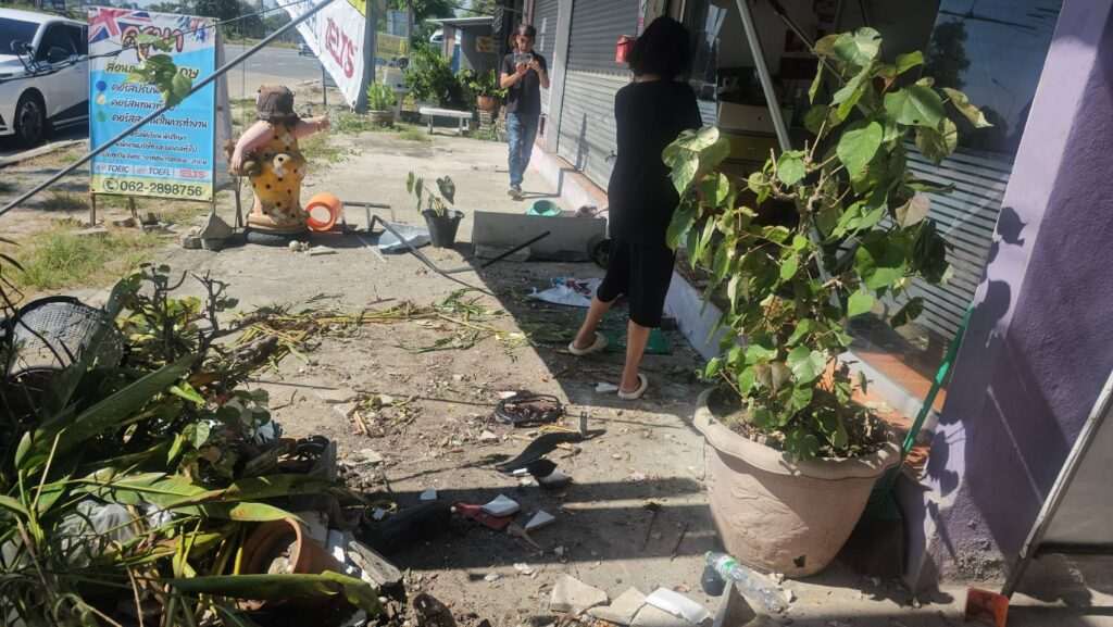 ทั้งรถทั้งคนพุ่งมาแรงจนชนขึ้นฟุตบาทจนบินลอยมาเลย ตัวคนขับลอยกระเด็นออกมาหัวชนเสาปูนที่เขาเอาไว้ปักคันร่มบังแดด และก็ ไปฟาดกับมุมบันไดห้องนึงและตัวก็กระเด็นมานอนอยู่ตรงหน้าร้านของครูนกรับสอนภาษาอังกฤษ
