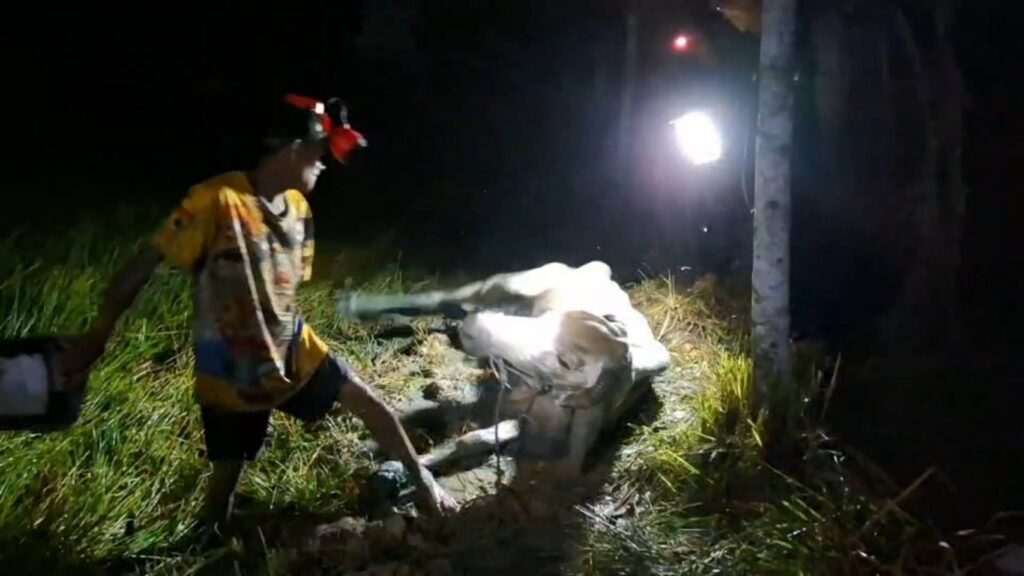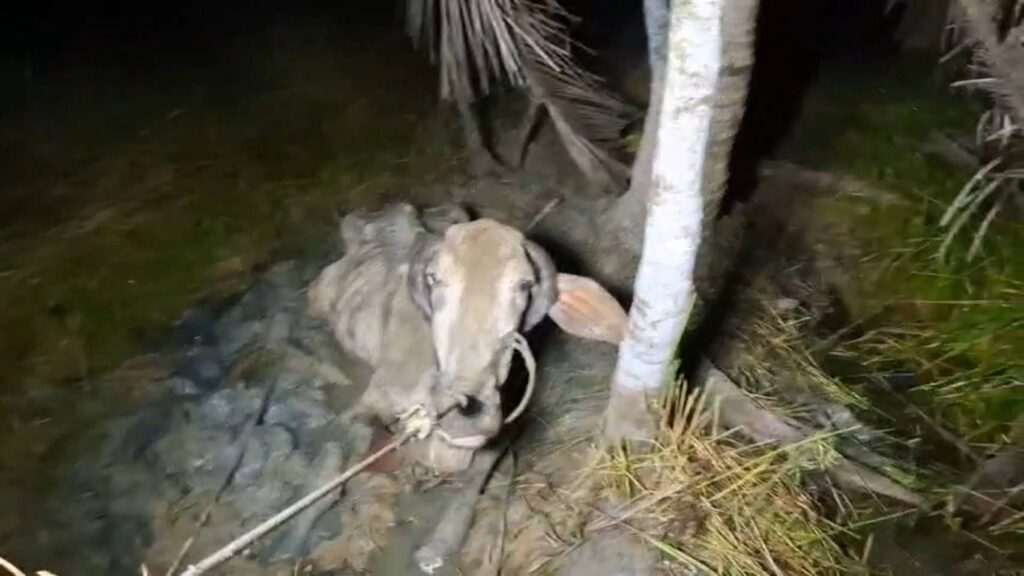 หลังจากที่นำวัวขึ้นมาจากโคลน ตนก็รีบเอาน้ำเอาหญ้ามาให้กิน วัวหมดแรงนอนๆอยู่ ยังยกขาหลังมาจะเตะตนอีก เป็นที่เอ็นดูของชาวกู้ภัยเลย คาดว่าจะโกรธแน่ๆ ช่วยช้าไปหน่อย