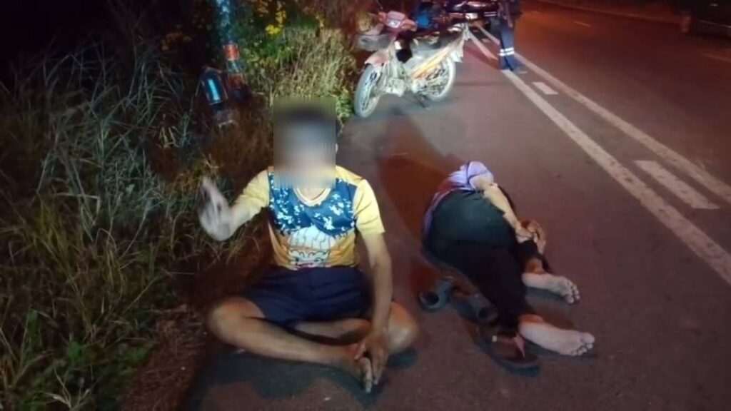ที่เกิดเหตุพบ ชายวัย 65 ปี 2 คนนั่งอยู่กลางถนนด้วยอาการมึนเมามีรถจักรยานยนต์สีน้ำเงิน ล้มอยู่กลางถนน