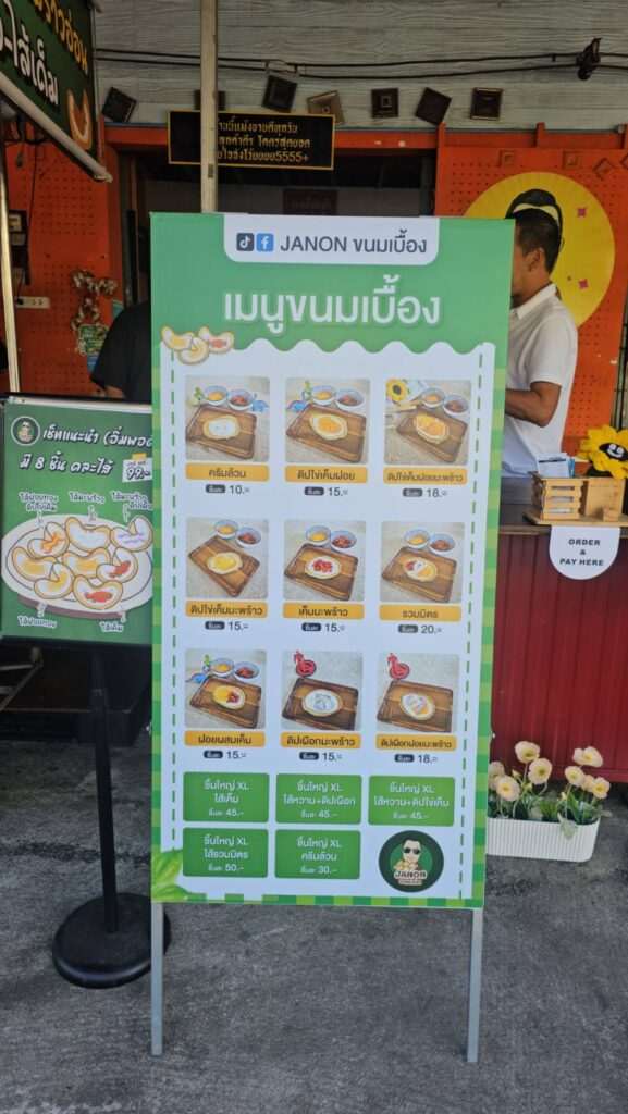 ตนมีความตั้งใจอยากจะพัฒนาให้ร้านเป็น “คาเฟ่ขนมเบื้อง” จึงได้จัดเตรียมโต๊ะเก้าอี้ไว้ให้ลูกค้าสามารถนั่งทานที่ร้านได้อย่างชิล ๆ ฟังเพลง พร้อมบริการ น้ำใบเตยฟรี อีกด้วย