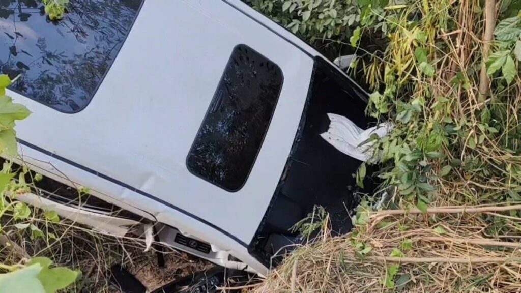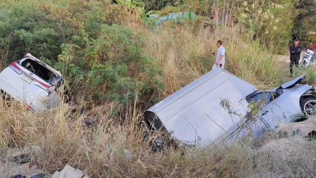 ​ในที่เกิดเหตุพบภาพสลด รถตู้ Toyota Alphard สีขาว สภาพพังยับเยิน เสียหลักตกลงไปในร่องน้ำลึกข้างทาง ภายในรถมีผู้บาดเจ็บ 2 ราย: