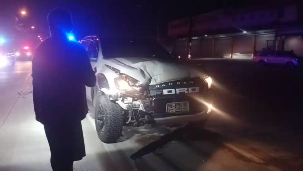 ​ใกล้กันพบรถคู่กรณีเป็นรถกระบะสี่ประตู ยี่ห้อฟอร์ด เรนเจอร์ สีขาว สภาพด้านหน้าพังเสียหายอย่างหนัก กันชนหลุดและฝากระโปรงยุบตัวลงมา