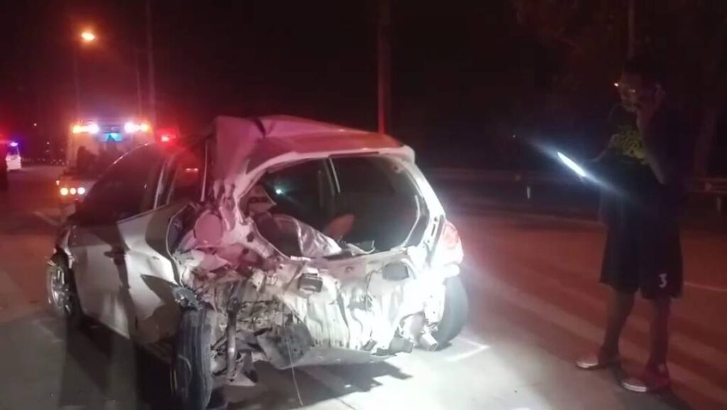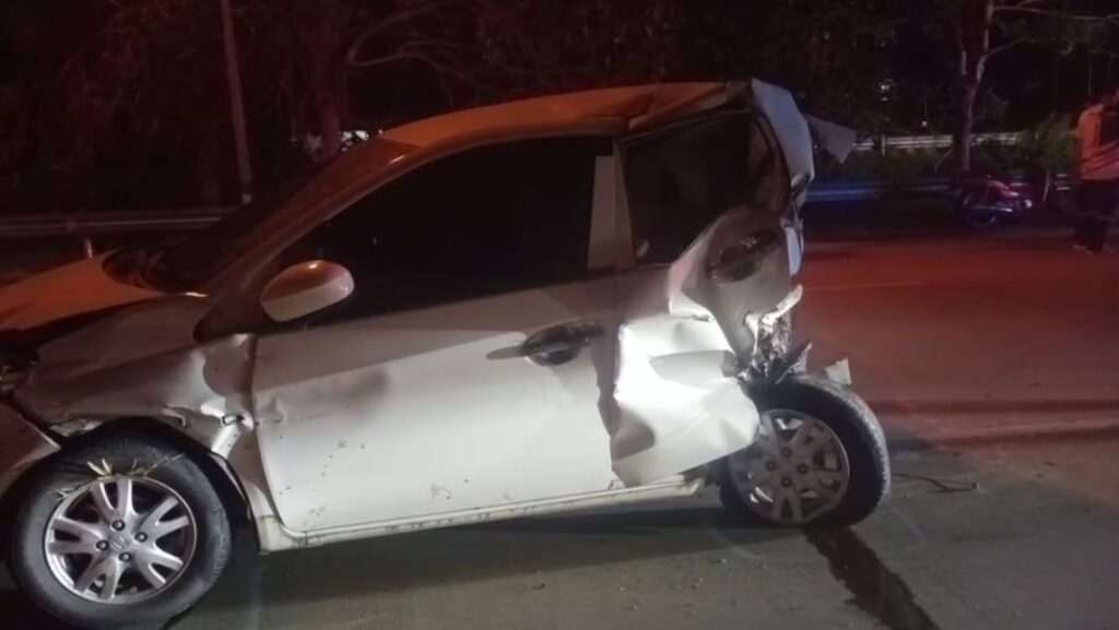 กระบะพุ่งเสยท้ายเก๋งสนั่น! แรงเหวี่ยงสยองคนขับเก๋งร่างกระเด็นดับคาถนนบายพาส 36