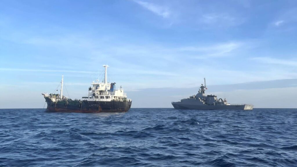 กระทั่ง เมื่อวันที่ 27 ธ.ค.68 เวลา 16.00 น.ขณะที่ เรือหลวงประจวบคีรีขันธ์ ลาดตระเวนในอ่าวไทย ตรวจพบเรือบรรทุกน้ำมัน มีพฤติกรรมน่าสงสัย ไม่แสดงชื่อเรือ และเลขทะเบียนเรือ ไม่ชักธง แสดงสัญชาติ และไม่เปิดระบบแสดงตนเอง AIS จอดเรือทิ้งสมอบริเวณ ระยะ 50 ไมล์ทะเล หรือ 90 กิโลเมตร ทางทิศใต้ของเกาะเสม็ด ดังนั้น จึงตัดสินใจส่งชุดเจ้าหน้าที่ขึ้นตรวจเยี่ยมสอบถามข้อมูล และขอตรวจสอบเอกสาร