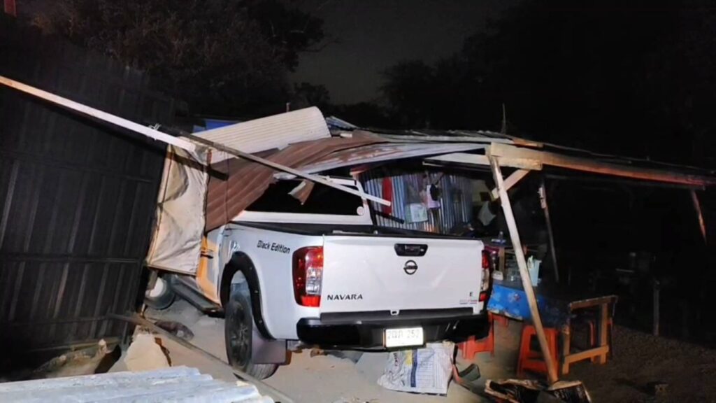 ​ห่างออกไปราว 20 เมตร พบรถกระบะ Nissan Navara สีขาว พุ่งเข้าไปอยู่กลางร้านลาบ-ก้อย สภาพหน้ารถและร้านที่เป็นเพลิงสังกะสีพังเสียหายหนัก