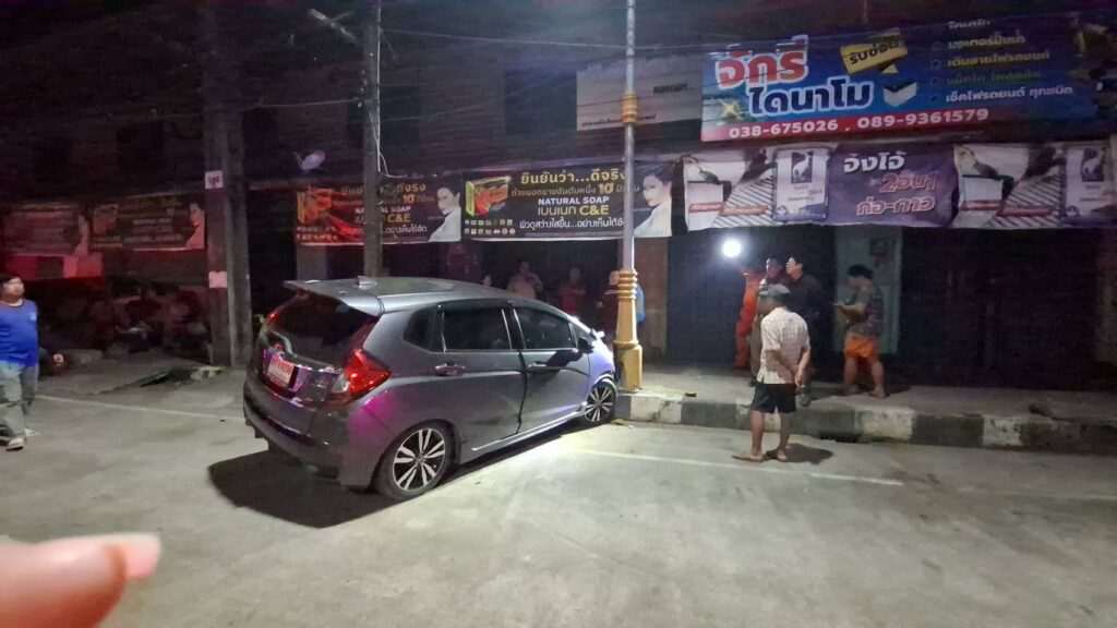 ในที่เกิดเหตุ พบรถยนต์เก๋งฮอนด้า สีดำ สภาพด้านหน้าพังยับเยินจากการพุ่งชนอัดติดอยู่กับเสาไฟฟ้าส่องสว่างจนเสาเอนเอียง ใกล้กันพบรถจักรยานยนต์ล้มคว่ำสภาพพังเสียหาย พบผู้บาดเจ็บเป็นชายวัยรุ่น 2 ราย อายุประมาณ 15 ปี