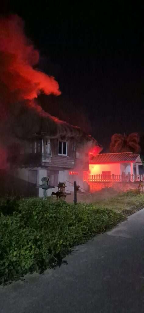 ในที่เกิดเหตุพบเพลิงกำลังโหมไหม้บ้านไม้ 2 ชั้นอย่างรุนแรง เปลวไฟสีแดงฉานพุ่งขึ้นสู่ท้องฟ้า ท่ามกลางเสียงไม้ลั่นและเสียงการพังทลายของโครงสร้างบ้านเป็นระยะ