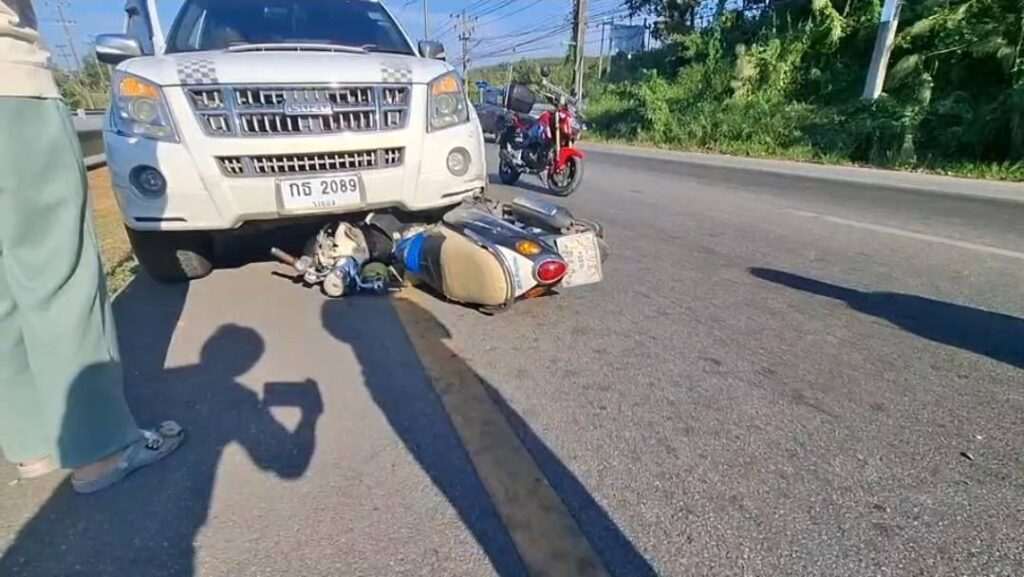 เมื่อเวลา 16.00 น. วันที่ 10 มกราคม 2569 เจ้าหน้าที่ตำรวจ สภ.กร่ำ จ.ระยอง ได้รับแจ้งมีอุบัติเหตุรถจักรยานยนต์เฉี่ยวชนกับรถยนต์กระบะ บนถนนสุขุมวิท ฝั่งขาเข้าเมืองระยอง บริเวณช่วงบ้านบ่อทอง หมู่ 5 ต.สองสลึง อ.แกลง จ.ระยอง หลังรับแจ้งจึงรีบรุดไปตรวจสอบพร้อมเจ้าหน้าที่กู้ภัย