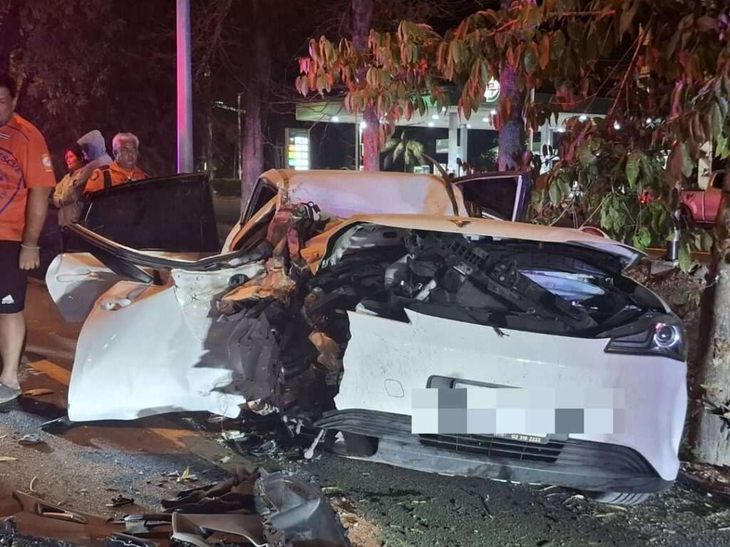 เมื่อมาถึงที่เกิดเหตุพบรถยนต์ไฟฟ้าสีขาว สภาพพังยับเยิน ตัวรถตะแคงอัดติดอยู่กับต้นไม้ ทำให้การทำงานของกู้ภัยเป็นไปด้วยความยากลำบาก