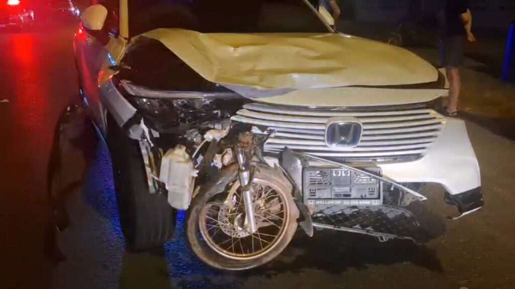ในที่เกิดเหตุพบรถยนต์เก๋งสีขาวจอดอยู่ สภาพด้านหน้าพังเสียหายอย่างหนัก โดยมีเศษซากของล้อรถจักรยานยนต์พ่วงข้างติดคาอยู่ที่บริเวณหน้ารถเก๋ง