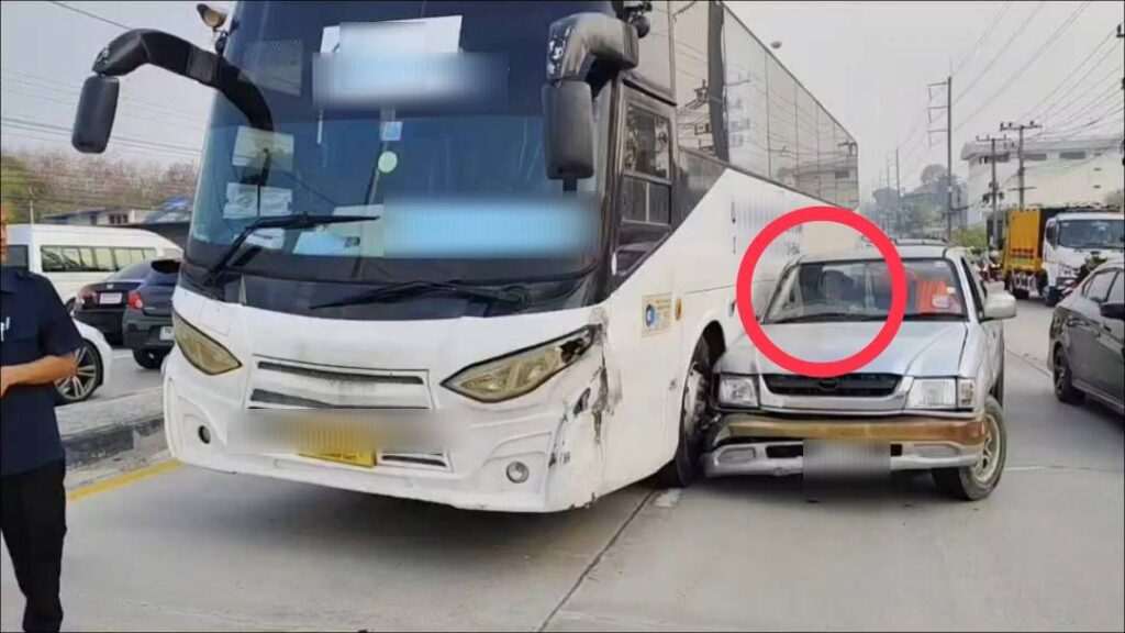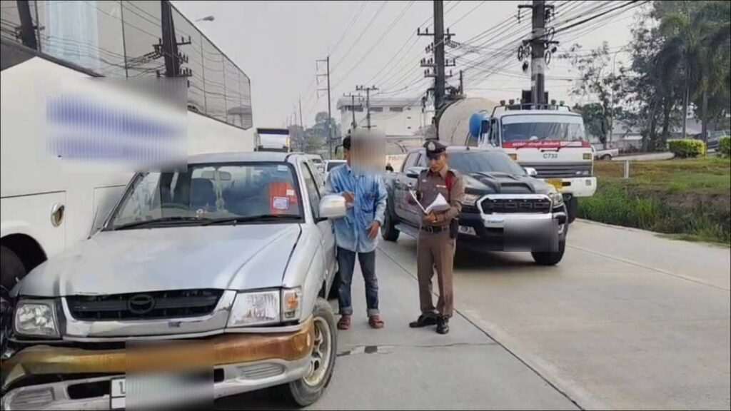 ลุงวัย 50 ขับกระบะชนรถบัสรับส่งพนักงาน กลิ่นเหล้าหึ่งแต่เจ้าตัวยัน “ไม่ผิด” ไม่ยอมลงจากรถ จนเกิดอุบัติเหตุซ้ำซ้อน รถติดหนักนับกิโลฯ ตำรวจขู่ใช้รถยกถึงยอมลงในสภาพเดินไม่ตรง