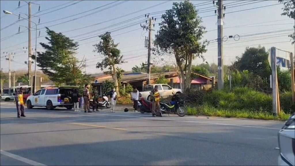 ในที่เกิดเหตุพบรถจักรยานยนต์ถูกรถกระบะชนเข้าอย่างจังจนแผ่นป้ายทะเบียนพับงอเข้าไปติดอยู่ในซุ้มล้อหลัง พังเสียหายทั้งคัน ห่างออกไปพบรถยนต์กระบะคู่กรณี สภาพด้านหน้าพังยับเยินจากการกระแทก