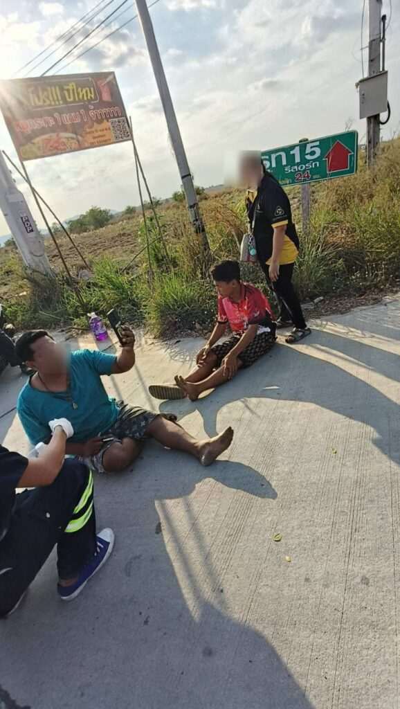 ​ในที่เกิดเหตุพบชาวบ้านกำลังยืนพูดคุยกันหลังแยกทั้งสองฝ่ายออกจากกัน ฝ่ายแรกคือ ชาย อายุ 58 ปี เป็นสมาชิกสภาเทศบาล (สท.) แห่งหนึ่ง ซึ่งเป็นคนขับรถกระบะ อยู่ในสภาพตื่นตระหนกและมีบาดแผลบริเวณริมฝีปาก อีกฝ่ายคือ ชาย อายุ 34 ปี และ ชาย อายุ 16 ปี สองพ่อลูกที่ขับขี่รถจักรยานยนต์มาและได้รับบาดเจ็บจากอุบัติเหตุ พบมีแผลถลอกตามร่างกาย เจ้าหน้าที่กู้ภัยเร่งปฐมพยาบาลและนำตัวส่งโรงพยาบาลนิคมพัฒนา