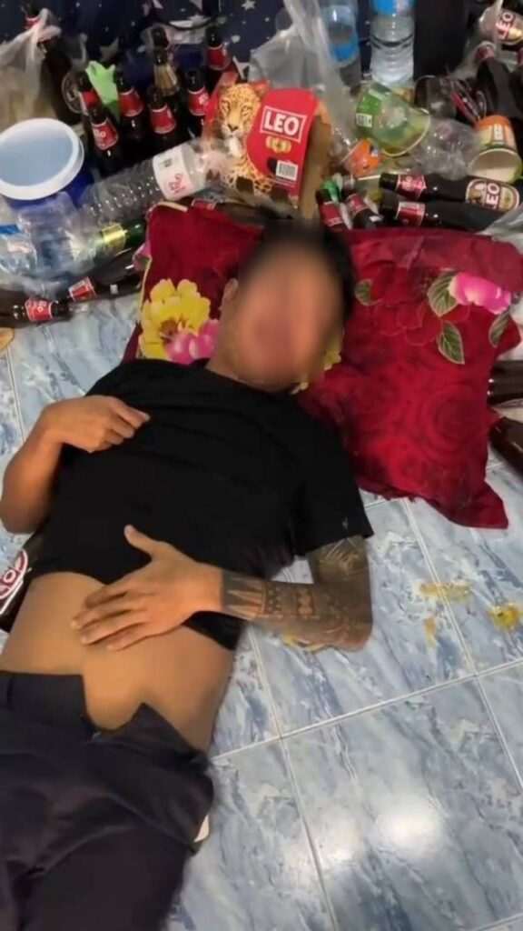 นาย SI THU KO KO OO อายุ 31 ปี ชาวเมียนมา สภาพสวมเสื้อยืดสีดำ กางเกงขาสั้น นอนหงายหมดสติอยู่บนพื้นกลางกองขวดเบียร์ มีอาการดิ้นทุรนทุราย ถามตอบไม่รู้เรื่อง และมีอาการคล้ายคนเมาอย่างหนักแต่ไม่สามารถประคองสติได้