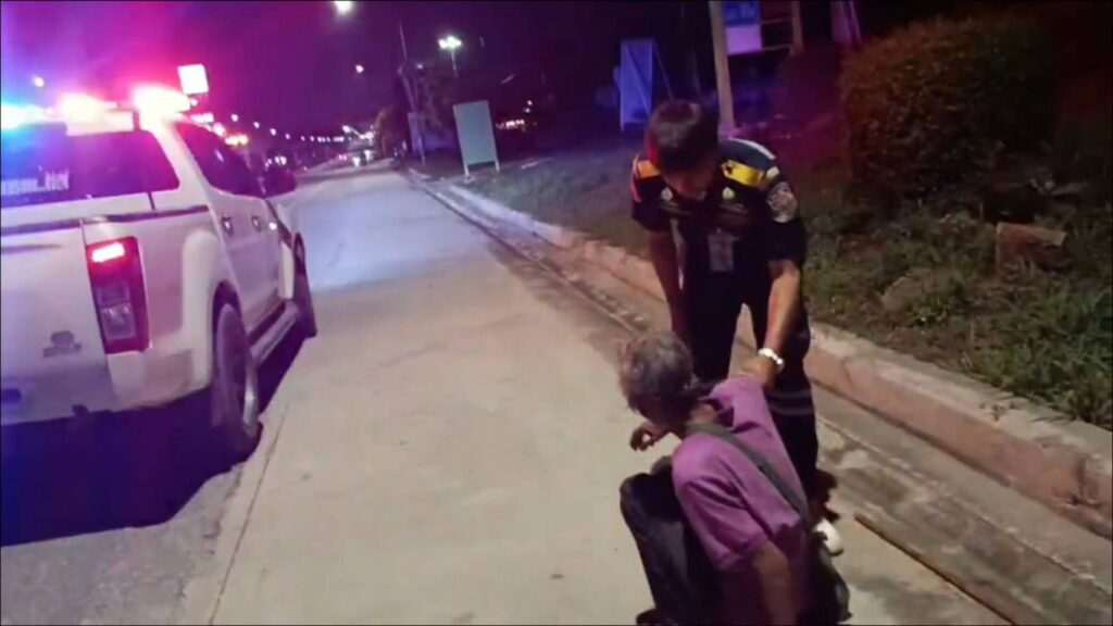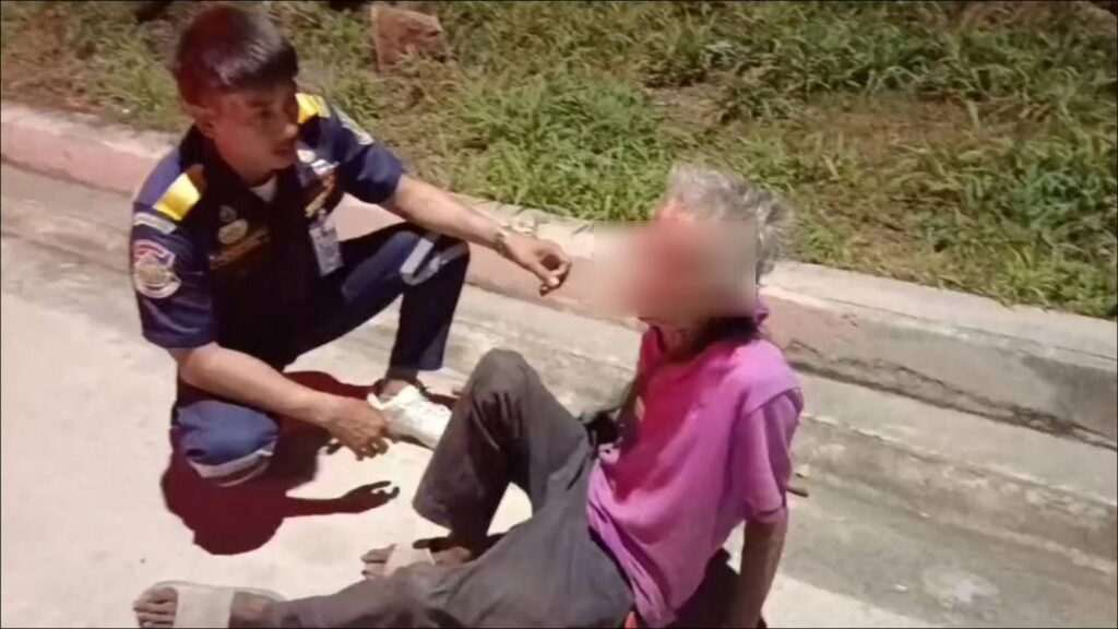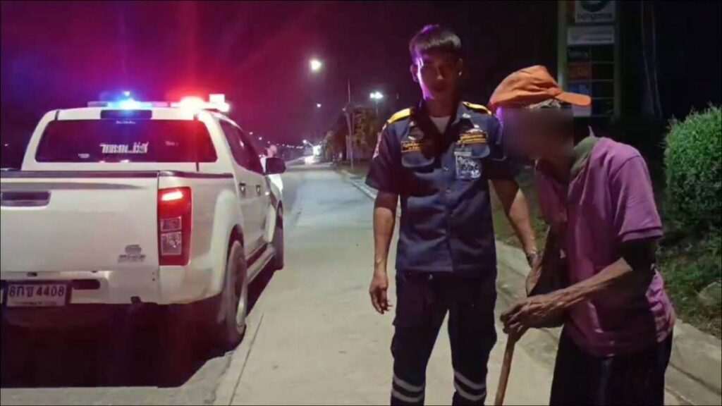 เมื่อเจ้าหน้าที่กู้ภัยเดินทางไปถึงจุดเกิดเหตุ พบชายสูงวัยสวมเสื้อยืดสีม่วง กางเกงขายาว สภาพนอนขดตัวอยู่ริมไหล่ทาง ซึ่งเป็นจุดที่ค่อนข้างอันตรายเนื่องจากมีรถสัญจรไปมา เจ้าหน้าที่จึงรีบเข้าตรวจสอบเพื่อประเมินอาการในเบื้องต้น