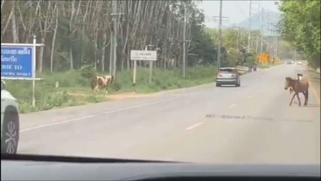ขณะเดียวกันมี ชาวโซเชียคลิปนาทีระทึก ขณะที่รถยนต์กำลังวิ่งบนถนนสุขุมวิท ช่วงอำเภอแกลง จ.ระยอง กลับต้องเบรกกะทันหันเมื่อพบ “ฝูงม้า” เดินทอดน่องอยู่กลางถนน โดยไม่เกรงกลัวรถที่วิ่งไปมา