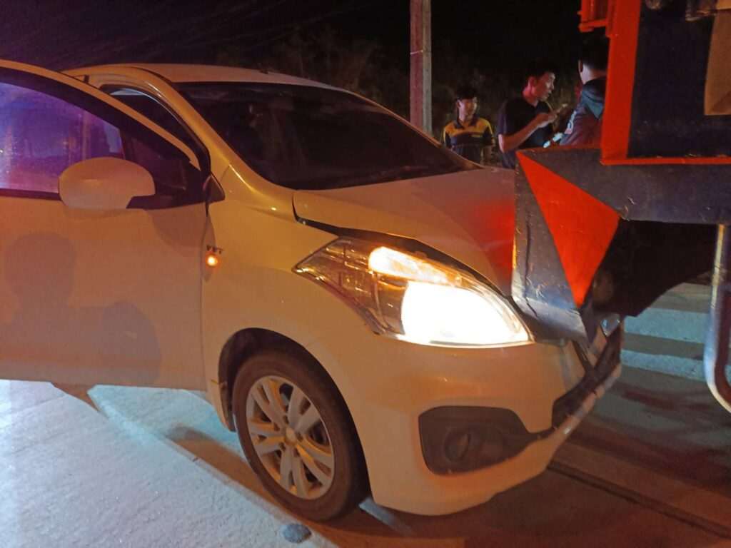 เมื่อรถเก๋งซูซูกิ สีขาว ป้ายทะเบียนระยอง พุ่งชนท้ายรถบรรทุก 6 ล้อเข้าอย่างจัง สภาพหน้ารถพังยับเยิน ฝากระโปรงยุบ แต่โชคดีที่ไม่มีผู้ได้รับบาดเจ็บ
