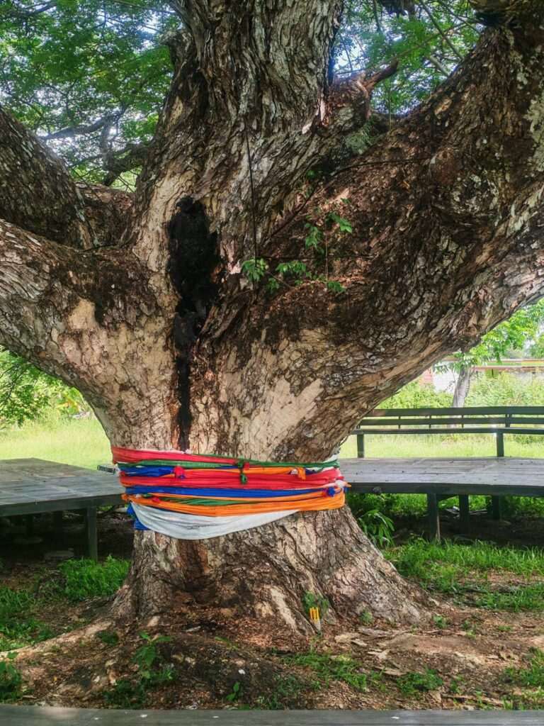 มีเทียนสีเหลือง จำนวน 4 เล่ม ปักอยู่ในขวดพลาสติกตัดครึ่ง วางไว้ที่โคนต้นพบมีคราบของเหลวสีคล้ำ คล้ายน้ำเทียนหรือน้ำมัน ไหลเป็นทางตามร่องเปลือกไม้