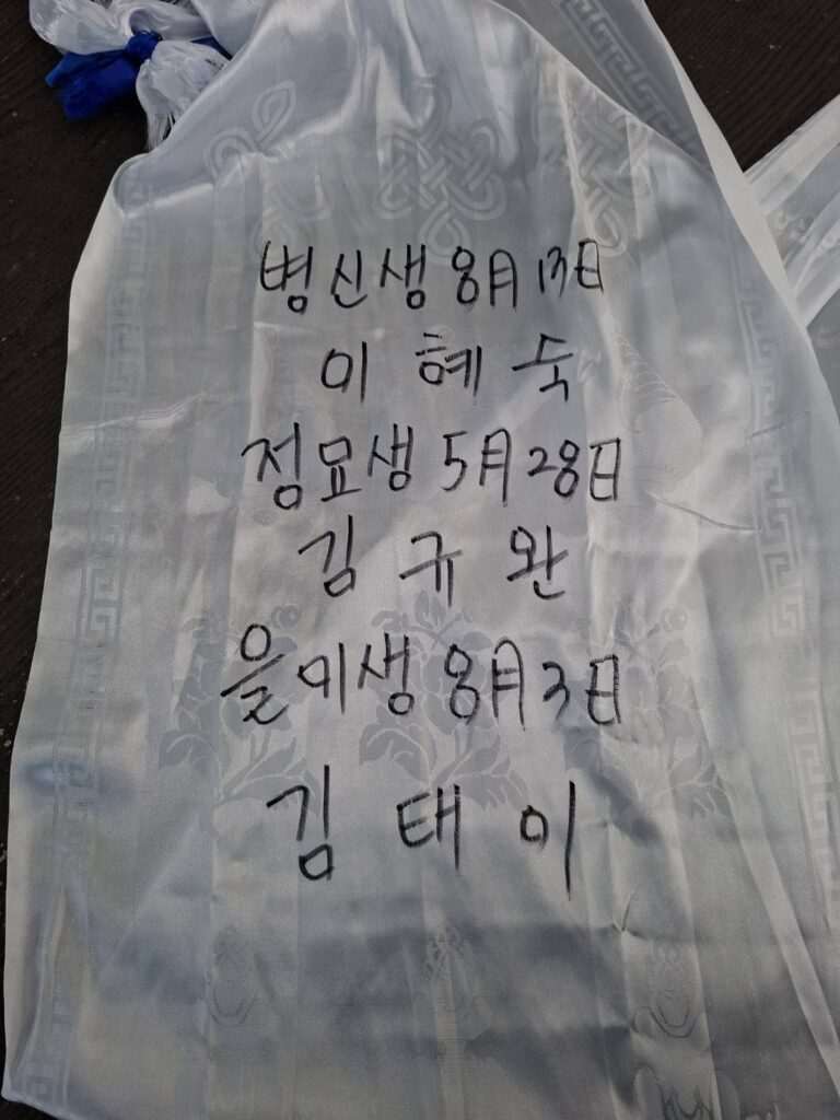 จากการตรวจสอบเบื้องต้นบนผืนผ้า พบว่ามีการเขียนชื่อบุคคลและวันเดือนปีเกิดเป็นภาษาเกาหลี ซึ่งมักพบเห็นได้ในพิธีกรรมขอพรหรือสะเดาะเคราะห์ตามความเชื่อท้องถิ่นของเกาหลี (Shamanism) แต่การข้ามมาทำพิธีถึงต้นไม้ใหญ่ในไทยถือเป็นเรื่องที่พบเห็นได้ยาก