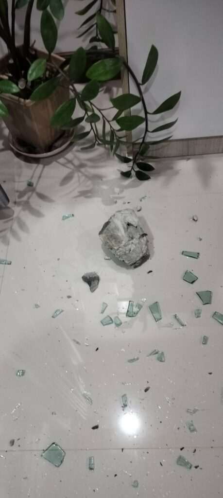 ซึ่งขณะนั้นลูกสาวของนายทวีศักดิ์กำลังนั่งเล่นอยู่ที่โซฟาพอดี โชคดีที่ปิดผ้าม่านไว้ทำให้หินไม่ถูกตัว แต่สร้างความตกใจจนลูกสาวร้องไห้โฮโทรหาพ่อให้รีบลางานกลับมาดู เมื่อมาถึงบ้านพบว่ากระจกบ้านแตกเสียหายมีหินก้อนใหญ่ตกอยู่หน้าทีวี ซึ่งขณะนั้นตนโทรแจ้งเจ้าหน้าที่ตำรวจรอ รออยู่เป็นชั่วโมงแต่ก็ไม่มีวี่แววว่าเจ้าหน้าที่ตำรวจจะมาดูในที่เกิดเหตุตนจึงเดินทางไปแจ้งความไว้ที่ สภ.นิคมพัฒนา นายปฐวี เพื่อนบ้านที่โดนบุกรุกคนแรก เล่าว่า ชายคนดังกล่าวอายุไม่เกิน 28 ปี ทรงเอ มีอาการลุกลี้ลุกลนอย่างเห็นได้ชัด ตะโกนถามหาแต่คนชื่อ “แป้ง” โดยอ้างว่าเมียปักหมุด GPS ให้มาหาที่นี่ แม้ตนจะปฏิเสธว่าไม่มีคนชื่อนี้อยู่ แต่คนร้ายไม่ฟังและพยายามบุกรุกเข้ามาถึง 2 ครั้ง จังหวะนั้นตนตะโกนถาม ก็บอกว่าไม่มีคนชื่อแป้งแต่เขาก็ยังเอาหินมาปาโชคดีที่โดนเสาบ้านพอตนเดินออกมาถึงประตูรั้ว เขาก็ขับจักรยานยนต์หนีไปทีแรกตั้งใจว่าจะจับส่งเจ้าหน้าที่ตำรวจ