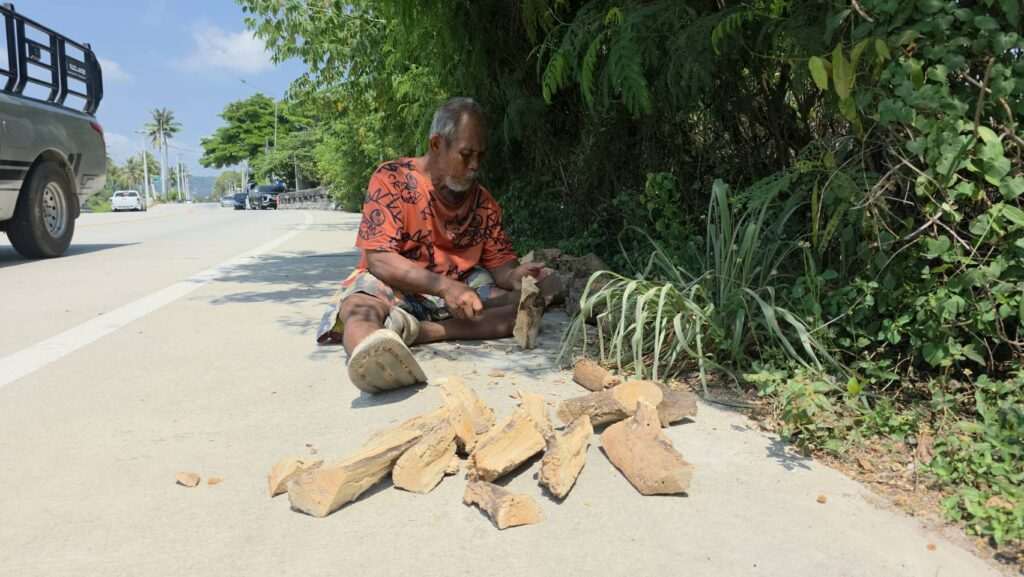 สำหรับฟืนที่นำมาผ่านั้น ลุงนริศระบุว่าเป็นกิ่งของ ต้นสาเก ซึ่งเป็นไม้สารพัดประโยชน์ นอกจากกิ่งก้านจะนำมาทำเป็นฟืนชั้นดีได้แล้ว ผลของมันหากแก่จัดยังสามารถนำไปทำเมนูของหวานอย่าง “สาเกเชื่อม” เพื่อรับประทานหรือแบ่งปันได้อีกด้วย