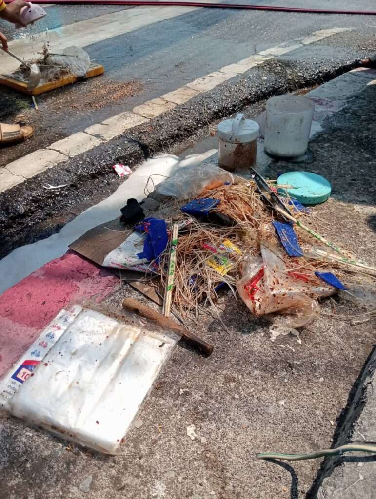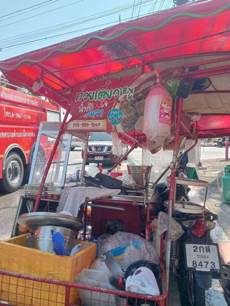ในที่เกิดเหตุ พบรถจักรยานยนต์สามล้อพ่วงข้าง สภาพดัดแปลงเป็นร้านขายก๋วยเตี๋ยวเคลื่อนที่ ได้รับความเสียหายอย่างหนัก อุปกรณ์ทำกิน ทั้งหม้อก๋วยเตี๋ยว ตะกร้าใส่เส้น และขวดเครื่องปรุง ตกกระจายเต็มพื้นถนน ส่วนรถคู่กรณีเป็นรถยนต์เก๋งแท็กซี่ สีชมพู-ขาว หมายเลขทะเบียน มฐ 5378 กรุงเทพมหานคร สภาพด้านหน้าซ้ายพังเสียหายจากการกระแทก