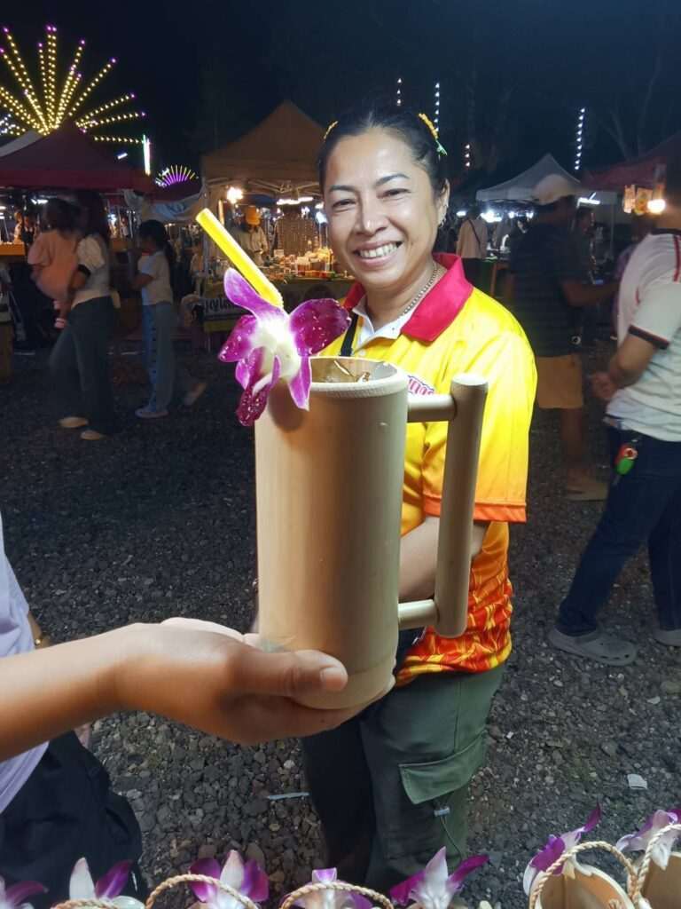 น.ส.ชาคริยา ผ่องศรี แม่ค้าขายน้ำมะพร้าวสดและน้ำตาลสด เปิดเผยว่า ตนเดินทางไปประกอบอาชีพตามงานเทศกาลต่างๆ ทั่วจังหวัดระยอง ทั้งงานวัดและงานกาชาด โดยมีแนวคิดหลักคือการใช้แก้วที่ทำจากไม้ไผ่ธรรมชาติซึ่งตนเป็นคนลงมือทำเองทั้งหมด และเป็นไม้ไผ่ที่ได้จากสวนของตัวเอง จึงช่วยลดการพึ่งพาแก้วพลาสติกที่นับวันจะมีราคาสูงขึ้นเป็นเงาตามตัว
