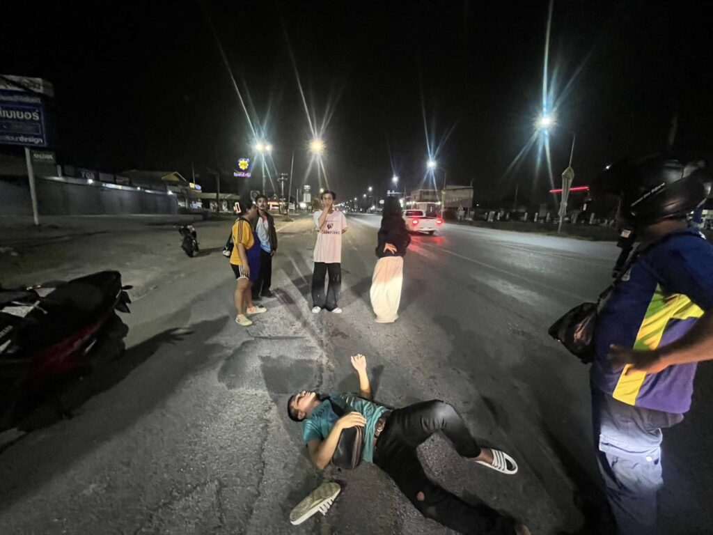 หมาทักกลางดึก หนุ่มขี่ บิ๊กไบค์ พุ่งชนลูกสุนัขวิ่งเล่นตัดหน้าหน้าปั๊ม ปตท. นิคมพัฒนา ร่างกระแทกพื้นหน้าแตกอาบเลือด กู้ภัยสยามระยองรุดช่วยเหลือนำส่งโรงพยาบาลด่วน